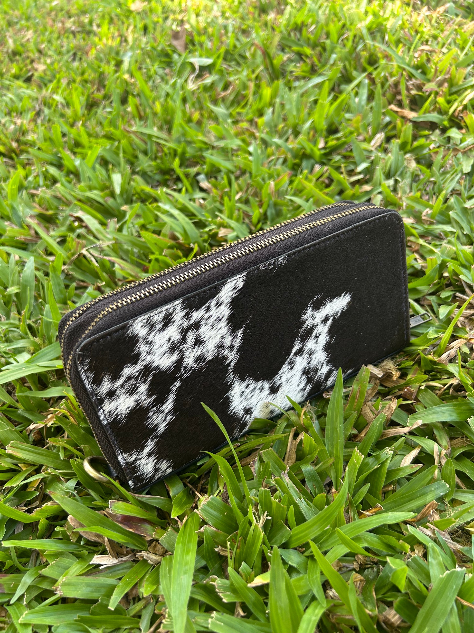 Black Leather Cowhide Double Zipper Purse with wrist strap 6